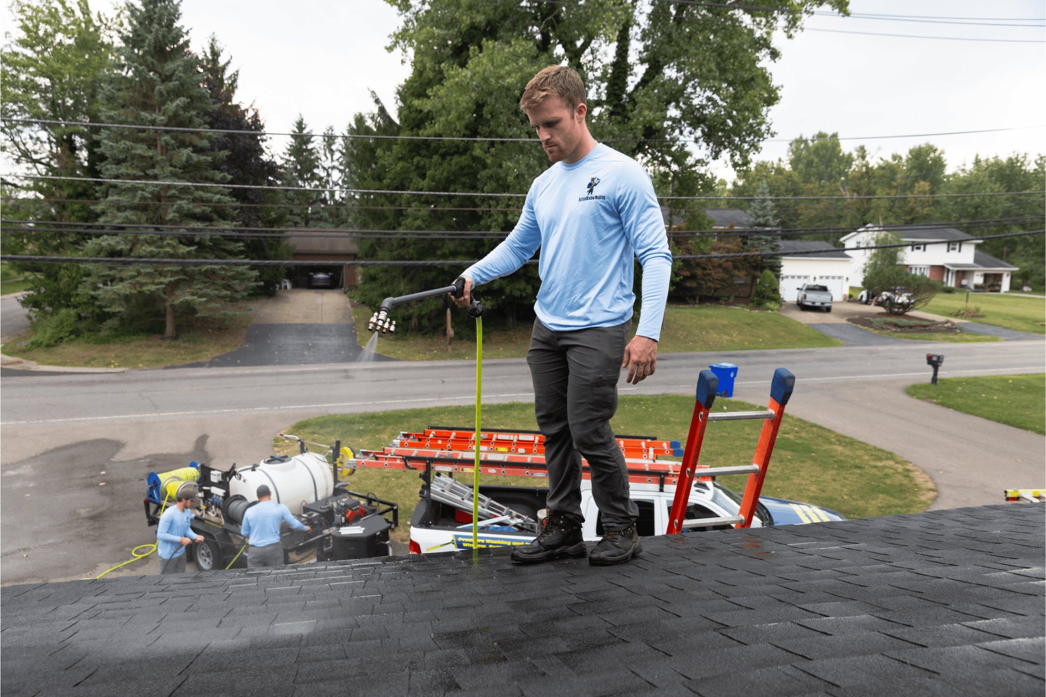 Our roof cleaning process is designed to safely restore the appearance of your roof while protecting its integrity. We take a careful, detail-oriented approach to remove buildup, stains, and organic growth without causing damage. Every step is performed with the proper methods and equipment to ensure long-lasting results and a cleaner, healthier roof.